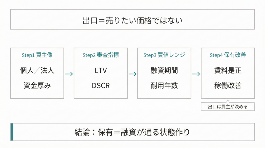 出口は「あなたが売りたい価格」ではなく「次の買主が買える条件」で決まります。買主の融資が通らなければ、いくら売り出しても成約しません。保有期間は「何年持つか」ではなく「次の買主が融資を組みやすい状態を作る工程」として設計します。