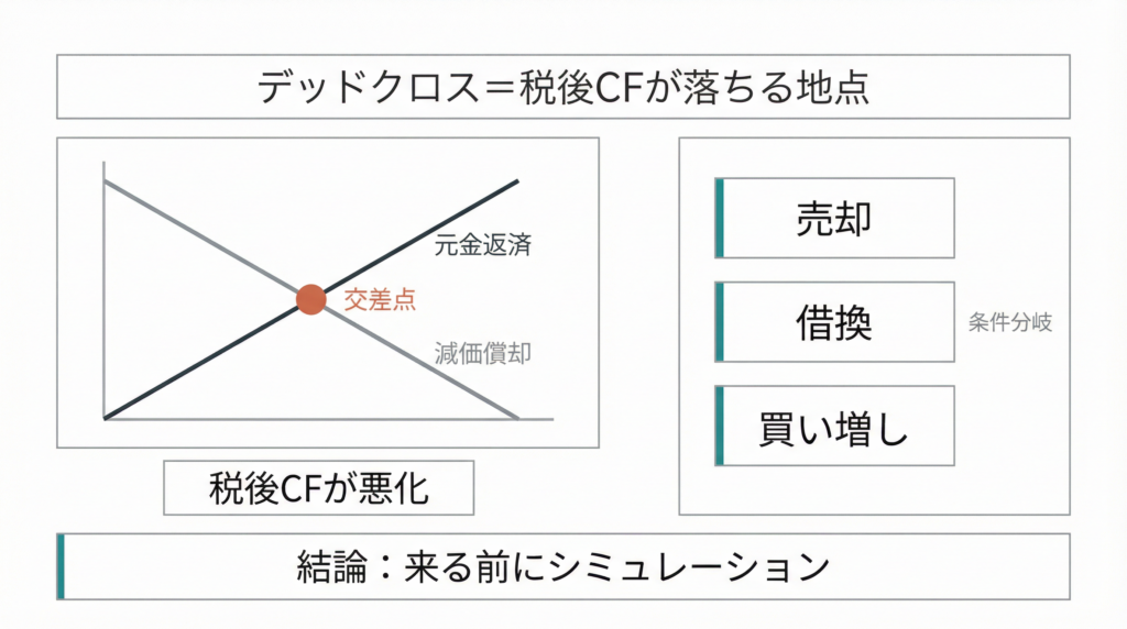 デッドクロスとは、ローンの元金返済額が減価償却費を上回り、帳簿上は利益が出ているのにキャッシュフローが悪化する局面のことです。「恐怖」として語られがちですが、事前に把握しておけば「売る・借り換える・買い増す」の判断ポイントとして使えます。