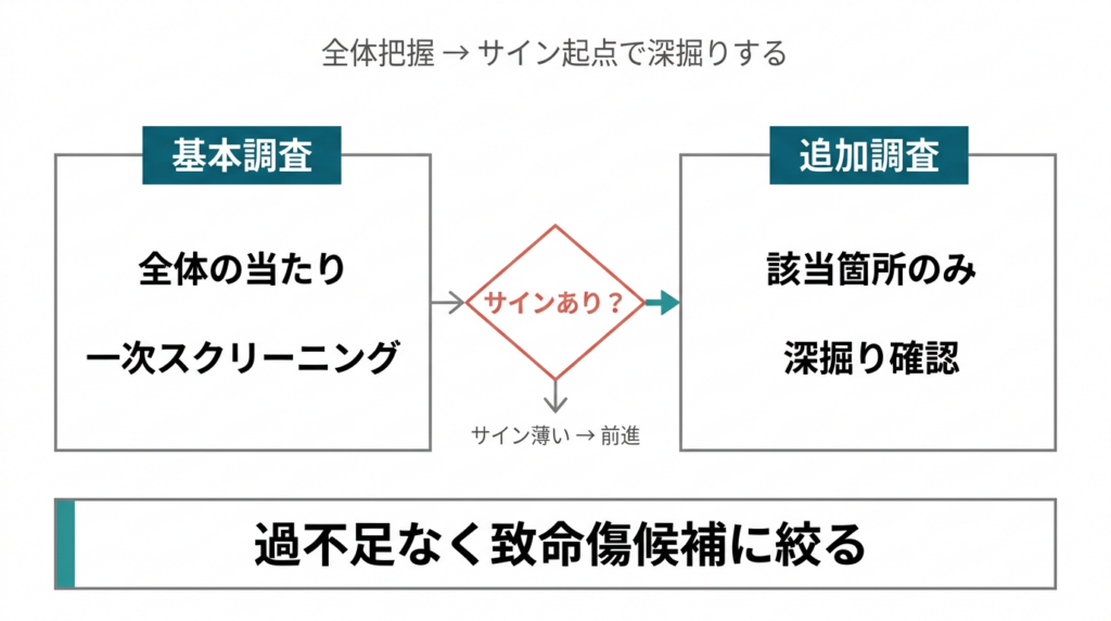 築古木造は不安論点が多いため、ついフルメニュー調査をしたくなります。ただ、すべてを最初から深掘りすると費用対効果が崩れやすく、意思決定が遅れます。実務では、全体把握(基本)→サインがある箇所だけ深掘り(追加)の順が合理的です。この順序なら、過不足なく「致命傷候補」に絞って調査できます。