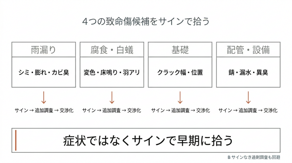 築古木造で見落としやすい論点は、雨漏り・腐食/白蟻・基礎・配管です。「症状」ではなく「サイン」で早期に拾うのがポイントです。