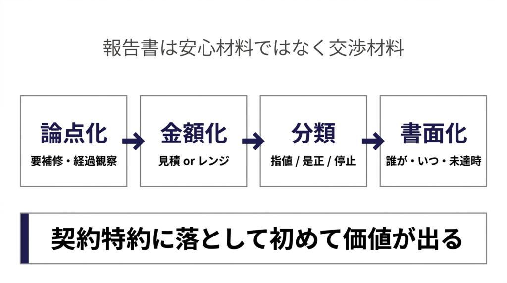 報告書を交渉材料へ接続する手順(指値・特約・説明責任)